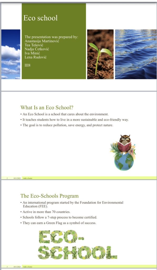 🍀Povodom Dana turizma 27.09. učenice odeljenja 3–8 pripremile su prezentaciju na temu „Eko-škola“, u saradnji sa svojom profesoricom engleskog jezika Jadrankom Ćorić.