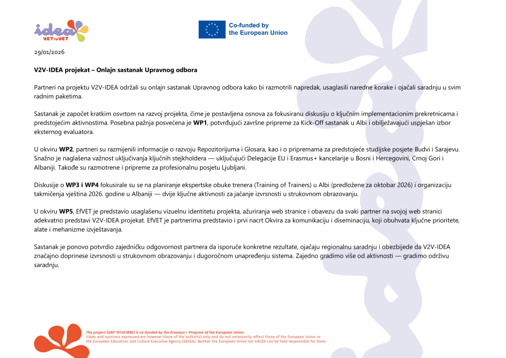 V2V-IDEA projekat – Onlajn sastanak Upravnog odbora