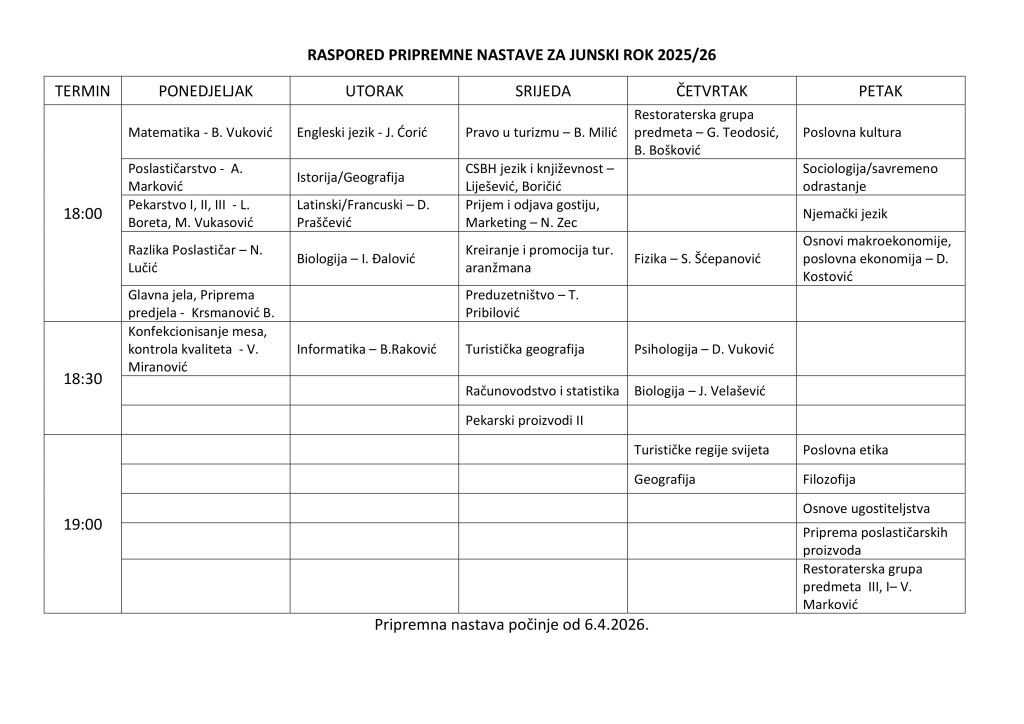 Raspored pripremne nastave za junski rok 2025/26.